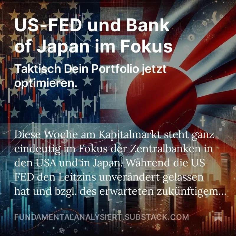 Während die US FED den Leitzins unverändert gelassen hat und bzgl. des erwarteten zukünftigem Zinsniveau nur leicht restriktiver (gegenüber vorherigen Äußerungen) wurde, hat die Bank of Japan das erste Mal seit 17 Jahren die Zinsen erhöht, ETF-Käufe eingestellt und die Yield-Curve-Controll beendet.